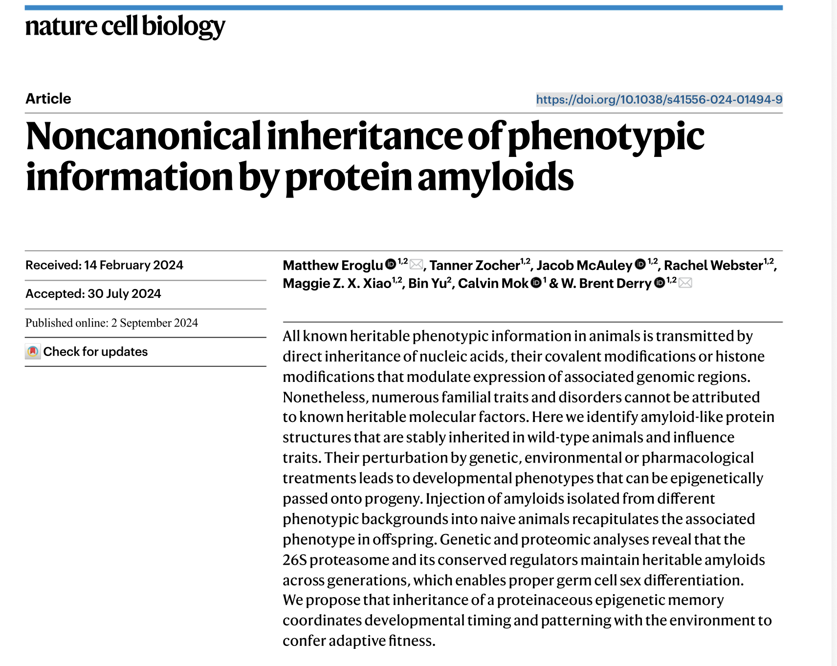Eroglu, M., Zocher, T., McAuley, J., Webster, R., Xiao, M. Z. X., Yu, B., Mok, C., & Derry, W. B. (2024). Noncanonical inheritance of phenotypic information by protein amyloids. Nature Cell Biology, 26(10), 1712-1724. https://doi.org/10.1038/s41556-024-01494-9