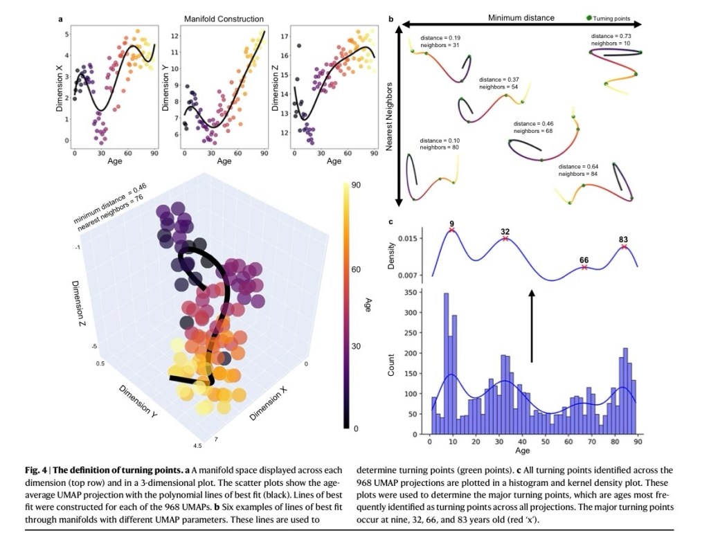 Los autores analizaron 12 métricas de redes cerebrales —como eficiencia, modularidad, centralidad, etc.— y usaron un método llamado UMAP para visualizar cómo evoluciona la organización cerebral a lo largo de la vida.
